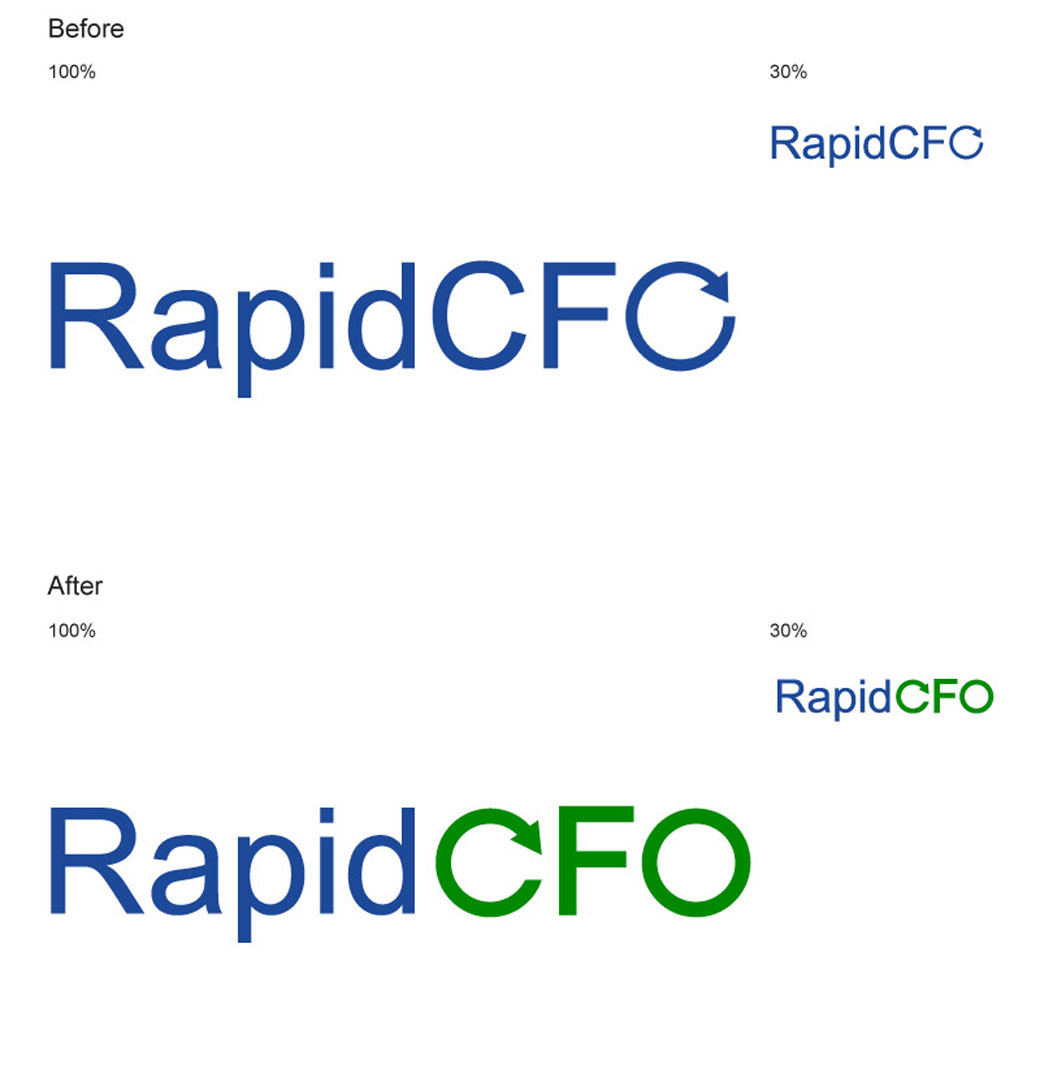点评:公司名字是“RapidCFO”,但字母“O”是一个开口的圆圈,会让用户将名字误解为“RapidCFC” 建议:我建议将原来字母“O”上带有箭头的设计用于字母“C”上,并使“O”恢复为完整的圆圈。并且,由于该公司主要涉及金融业务,使用另一种品牌颜色比如绿色会加强用户对公司的印象。